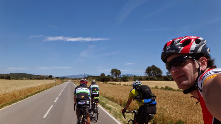 El pa que portem en pernil i formatge ens senten a gloria, la cerveseta les pastes dolces, ..... buff quina gana que portem. Mengem tranquil·lament fins que comencen a caure gotes, per sort els tres hem recordat d'agafar el "xubasquero" que ens posem ràpidament i au a la carretera, només un kilòmetre més davant ens cau un bon xàfec, però no parem sinó ens gelem i ja no arranquem, només dura uns minuts però la carretera ha quedat ben embassada, continuem en precaució i als pocs kilòmetres tot esta eixut, així que tornem a pedalar fort avançant el màxim de ràpid, ens anem ajuntant en gent alguns fan relleus altres es posen a roda i gaudeixen del rebufo.