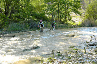 Ràpidament arribem als falsos plans que rodegen l'embassament de Santolea molt de encreuament i s'ha d'estar despert que sinó t'equivoques, entrem a un nou tram de sender que va a parar al Salto del Huergo, es un altre lloc pel que tindre que torna a passar per que ¿qui va mirar?? jo continuo pedalant i sant tornem-hi al riu, aquí ja va el primer destacat i natros dos, els següent no molt lluny però a les pujades van perdent.