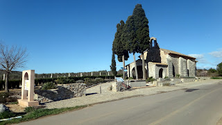Passem de llarg del Refugi continuant per sender cap a Pinar Pla entre els pins es veu un cel cada vegada més fosc i de tant en tant plou, relliscant per aquí i per allà arribem a Pinar Pla on sembla que ha plogut més però ara no ho fa, per a evitar la sendera que porta a l'ermita de St.Miquel que estarà impossible pugem el Coll de Tombadors on agafem la pista del Tossal dels Tres Reis i avanç de arribar-hi avall cap a l'ermita. Arribem a l'ermita plovent de valent, entrem a una de les portes per a netejar de fang les rodes i cambis.